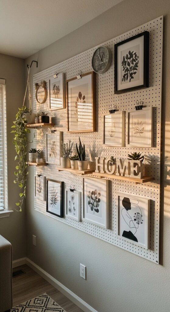 A pegboard makes one of the best gallery walls you can build because nothing requires holes in the drywall and every piece is completely repositionable. Hang framed prints with large binder clips attached to hooks. Add small shelves for three-dimensional objects. Mix in plants, mirrors, and decorative letters. Rearrange the layout any time the mood strikes. Paint the board to match your wall and the hooks disappear — all you see is the art. This is especially great for renters who want a real gallery wall without the patching-before-you-move-out panic.