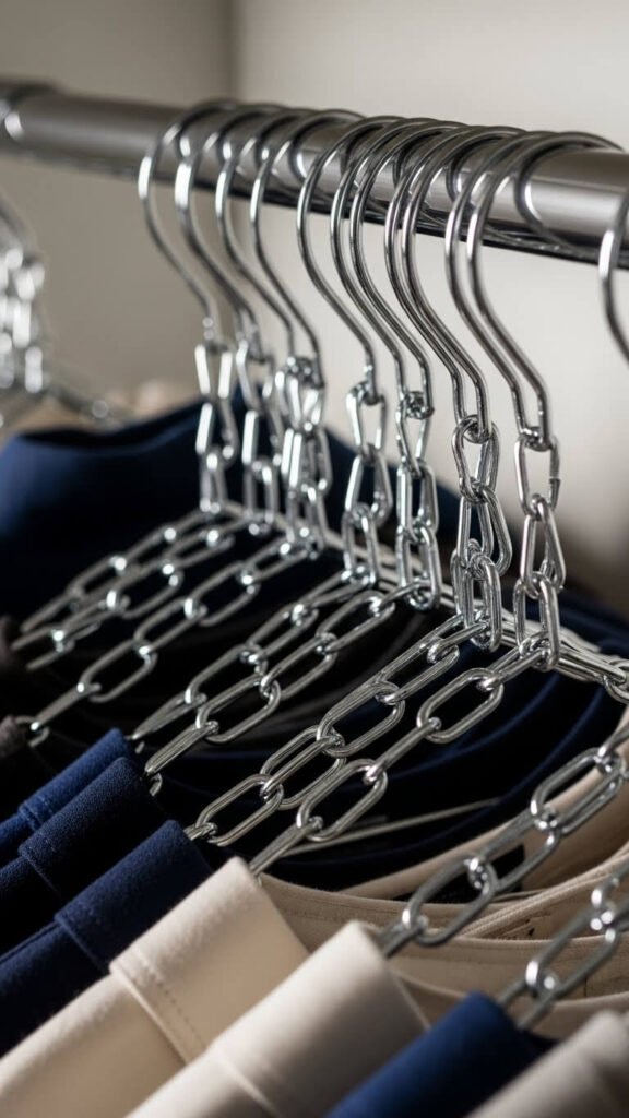 This method works perfectly for tanks, lightweight dresses, or scarves. One rod position now holds five items instead of one. Dollar store shower curtain rings offer the same effect. Thread several hangers through a single ring for grouped outfits.