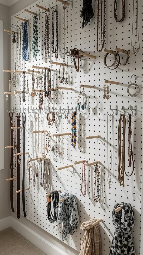 A 4×8 pegboard sheet costs $20 and adapts to any closet size. Paint it to match your walls, then mount with brackets. Add hooks anywhere you need them. Move them seasonally as your storage demands shift.