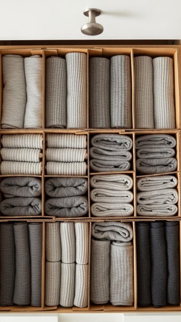 This costs absolutely nothing and takes ten minutes. Measure drawer dimensions first, then cut boxes accordingly. Arrange compartments based on what you own—small squares for jewelry, rectangles for scarves.