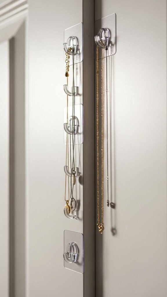 Space hooks 4 inches apart vertically. Longer necklaces go on lower hooks, chokers up high. This uses otherwise wasted door space. A 10-pack costs $6 and installs in minutes.