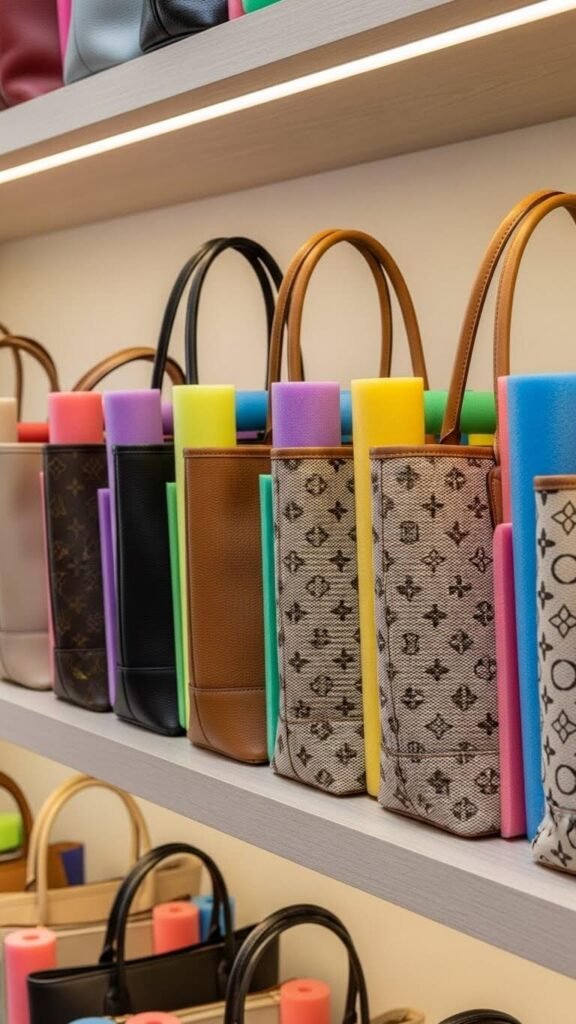 Dollar stores sell pool noodles for $1. One noodle stuffs six purses. The lightweight material won’t stress bag seams. Remove sections when using bags, then replace them after.