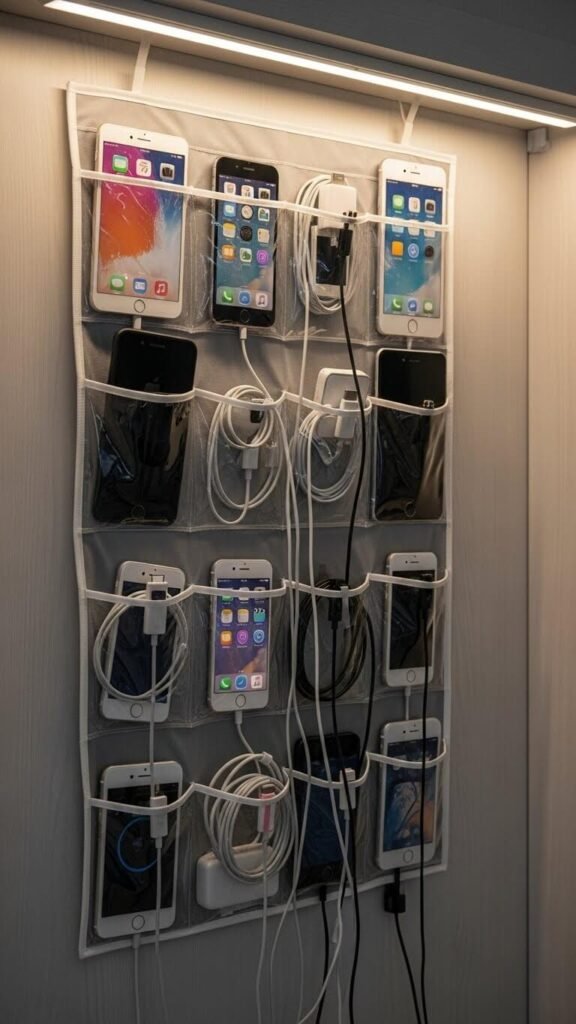 Hanging shoe organizers become bedroom charging stations. Drill a small hole in the back pocket for cable routing. Devices charge inside individual compartments, keeping cords tidy and gadgets dust-free.