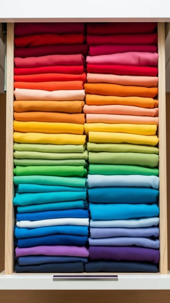 This system works for kids’ closets too. Each child gets a hanger color. Laundry sorting becomes foolproof. The rainbow effect looks professionally organized.