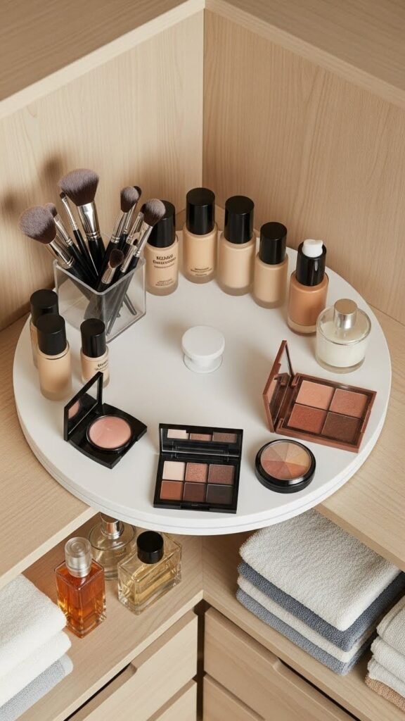 Stack two lazy susans vertically for maximum corner use. The bottom holds shoes, the top holds bags. This simple addition reclaims dead space instantly.