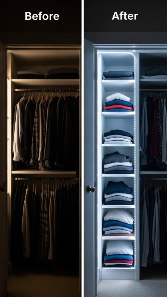 Battery-powered LED strips stick to any shelf edge. Suddenly, you can see dark closet corners without overhead lights. Motion-activated versions light up when you open doors.