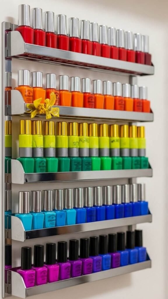 A three-tier rack costs $10 and holds 30+ bottles. Mount it inside closet doors or on walls. The organization prevents dried-out polishes hiding in drawers. You’ll use what you own.