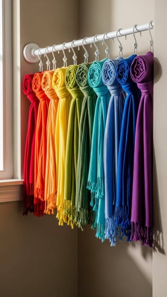 Wooden skirt hangers with clips organize scarves beautifully. Fold each scarf lengthwise, clip at both ends, and hang. See every pattern instantly instead of digging through drawers.