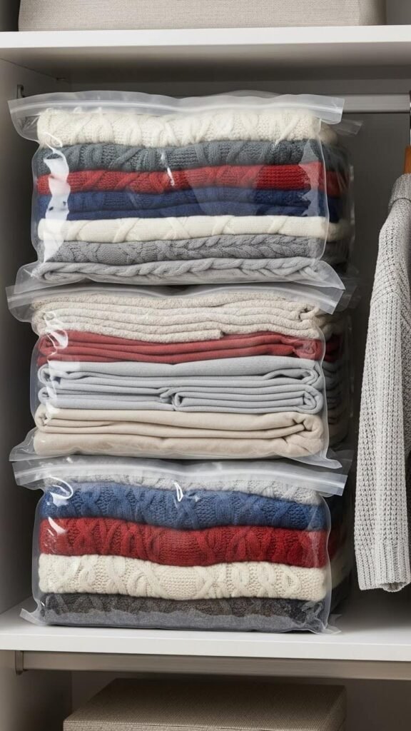 Vacuum storage bags compress bulky winter clothes to a quarter of their original size. Stack them on high shelves during summer months. A five-bag set costs $15 and reclaims cubic feet of space.