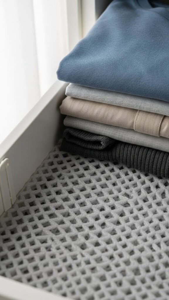 Non-slip drawer liners prevent clothes from shifting every time you open drawers. Folded stacks stay aligned. The grip surface costs $8 for enough liner to cover five drawers.