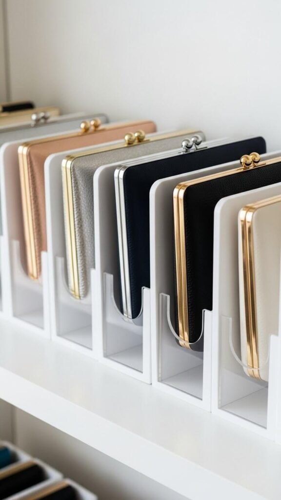 Vertical magazine files keep clutches upright and separated. Each purse gets its own slot, preventing scratches and maintaining shape. Clear acrylic versions let you see contents instantly.
