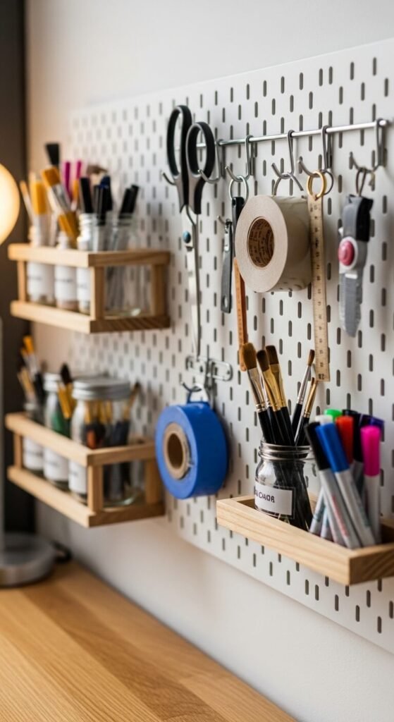 A pegboard is one of the most affordable wall organization tools available. You can find them at any hardware store for under $30. Mount it above your desk and hang everything from scissors to tape dispensers. Hooks are interchangeable, so you can rearrange anytime your workflow changes. Paint it a fun color to match your room. Add small wooden shelves or wire baskets for extra storage depth. It keeps your most-used tools visible and within arm’s reach.