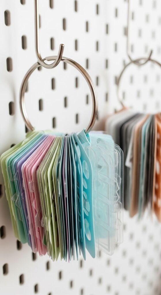 Die cuts and templates pile up fast and are nearly impossible to sort through in a flat stack. Punch a hole in each one and thread them onto a large binder ring. Hang the ring on a pegboard hook or in a binder. Sort by shape type or project category. This method costs almost nothing and makes flipping through your collection fast and easy. You can add or remove pieces anytime. Binder rings come in multipacks for a dollar or two.