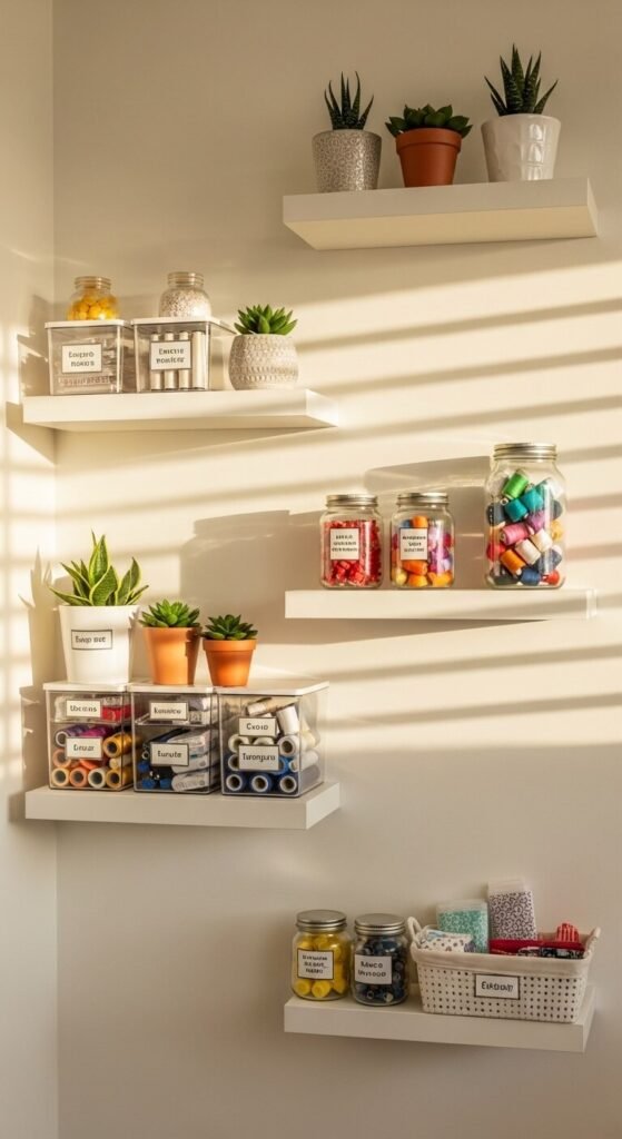 When floor space runs out, go vertical. Floating shelves add significant storage without taking up any floor real estate. Install them at varying heights to accommodate supplies of different sizes. Use the lower shelves for heavy bins and the upper ones for lighter items and decor. White shelves from IKEA cost around $10 to $15 each. Add small baskets or bins to keep things tidy. Floating shelves also make your craft room look clean and intentional rather than cluttered.