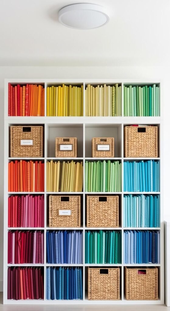 Fabric is one of the hardest supplies to wrangle. A cube organizer solves the problem beautifully. Fold your fabric into uniform squares and store them upright in each cube — like files in a filing cabinet. Organize by color, weight, or project type. You can see every piece without digging. Add small bins in some cubes for notions like thread, buttons, and zippers. A basic 9-cube organizer runs about $40 to $60 and holds a surprising amount of material.