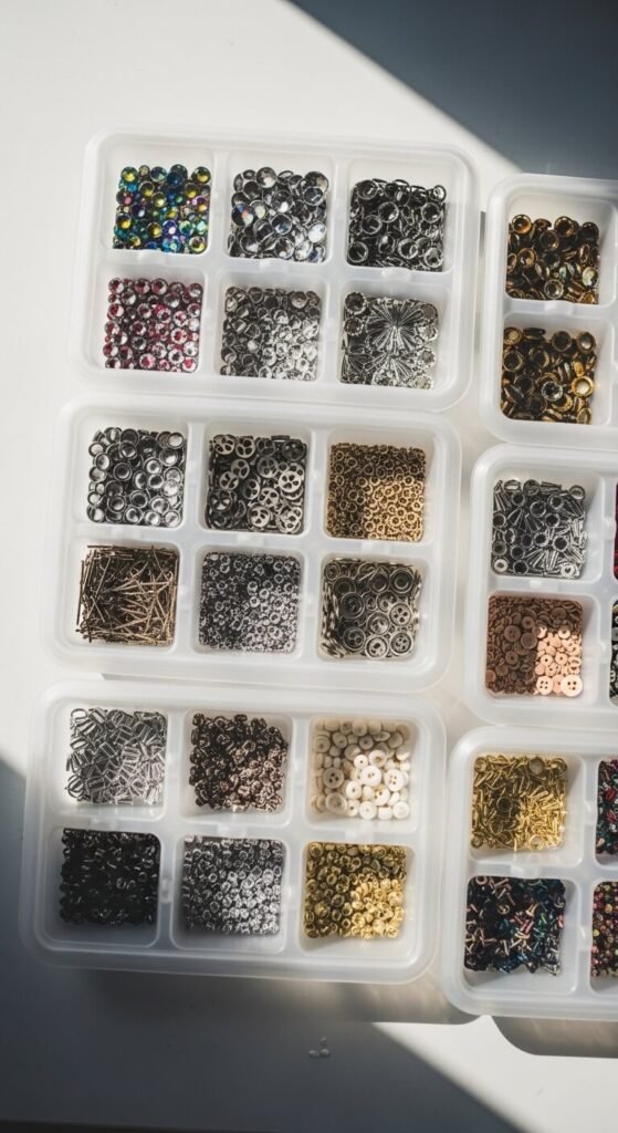 Tiny embellishments are impossible to manage in larger containers. They mix together, get lost, and cause frustration mid-project. Ice cube trays are the perfect solution. Each compartment holds one type of embellishment. Store rhinestones, brads, mini buttons, and charms all in separate cells. Stack the trays in a shallow drawer or on a shelf. A set of clear trays costs almost nothing at the dollar store. You can see exactly what you have without dumping anything out.