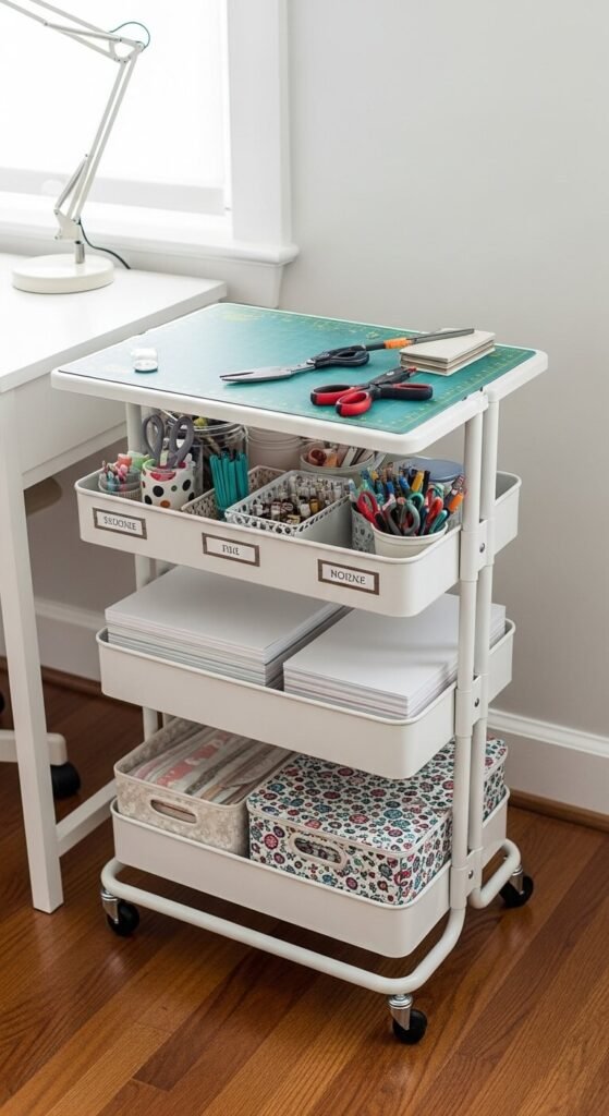 A rolling cart is one of the most flexible organization tools you can own. You can move your supplies to wherever you are working. Use each tier for a different category — one for paper crafts, one for cutting tools, one for adhesives. The ALEX cart from IKEA has become a craft room staple for a reason. It rolls easily, holds a lot, and looks great. When you are done crafting, roll it into a corner and your workspace is clear again.