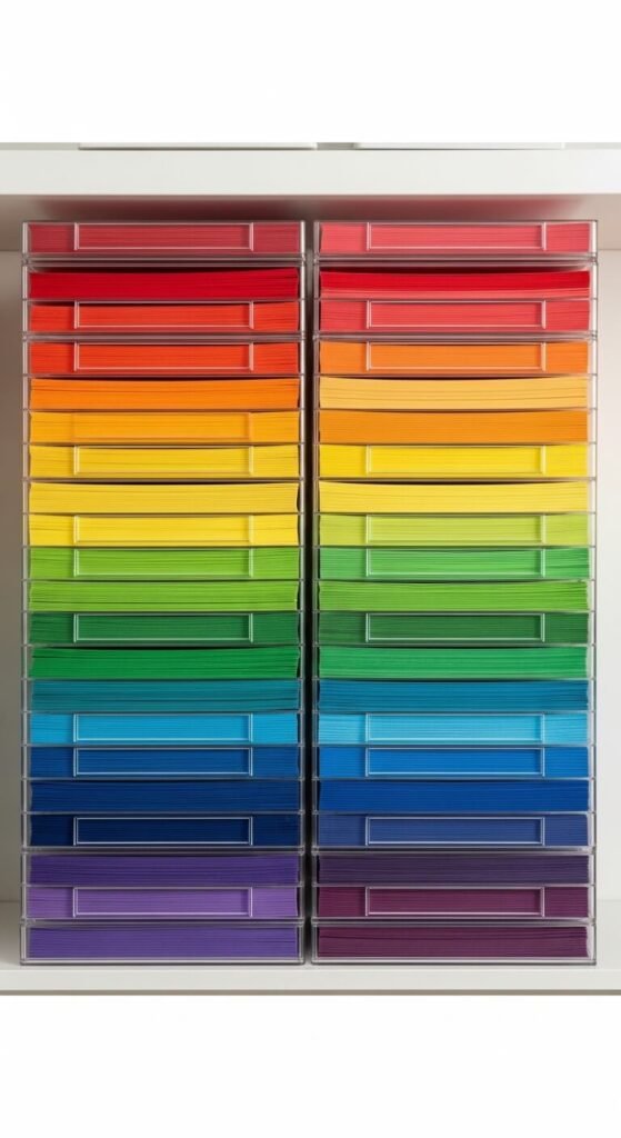 Cardstock and patterned paper are hard to sort through when they are all flat in a stack. Clear stackable boxes let you sort by color and see every sheet immediately. Stand paper sheets upright inside each box for easy flipping. Stack the boxes on a shelf organized by color family. Acrylic options look sleek, but cheaper plastic boxes from IKEA or the dollar store work just as well. This system makes finding the exact paper you need fast and satisfying.