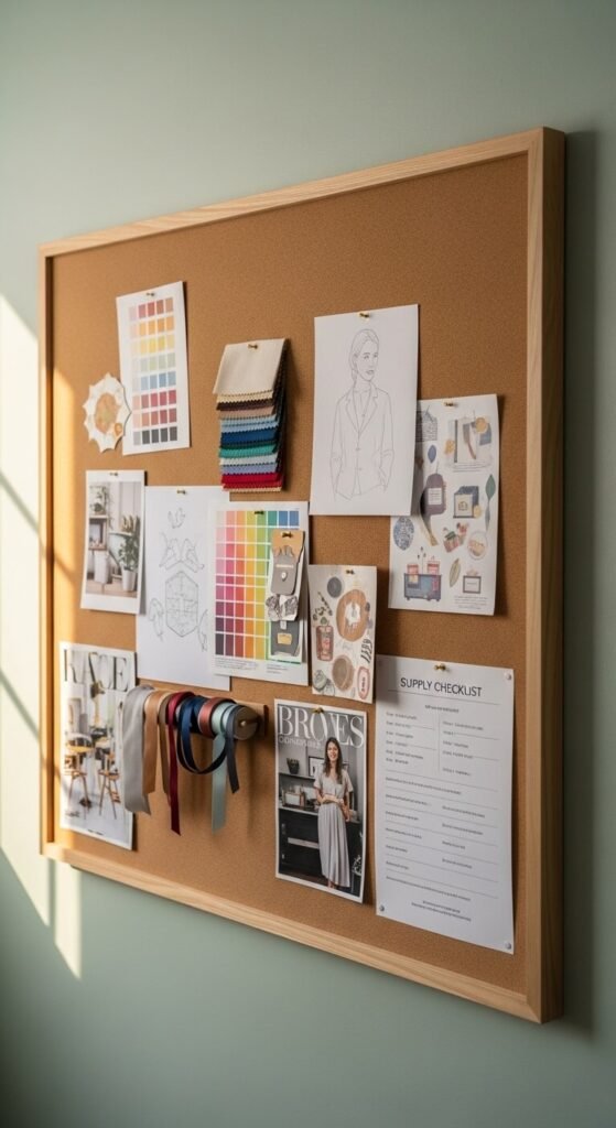 A corkboard is more than a mood board. It is a working tool. Pin current project inspiration alongside supply checklists, fabric swatches, and color palettes. Having your vision in front of you keeps projects moving forward. Use different colored pins for different projects. Add a small envelope or pocket to hold receipts or project notes. Corkboards come in all sizes and frames. A 24×36 inch board costs around $15 to $25. Hang it somewhere you will see it every time you craft.