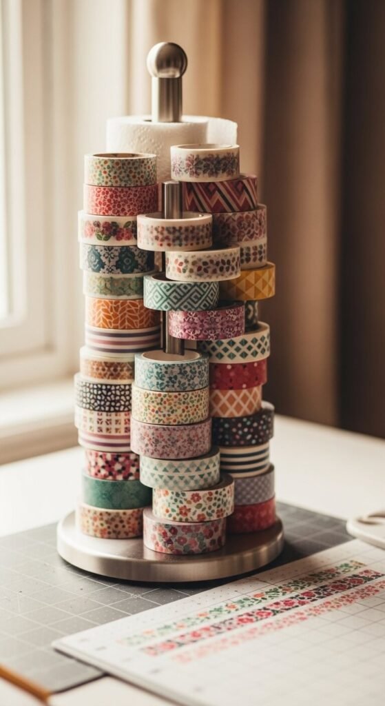 Washi tape is one of those supplies that multiplies fast. Before long you have dozens of rolls and no good way to store them. A vertical paper towel holder is the easiest fix. Stack rolls directly onto the rod. They are all visible, all accessible, and easy to swap out. A countertop holder fits about 20 to 30 rolls depending on their width. This takes up almost zero desk space and costs nothing if you have a spare holder at home.