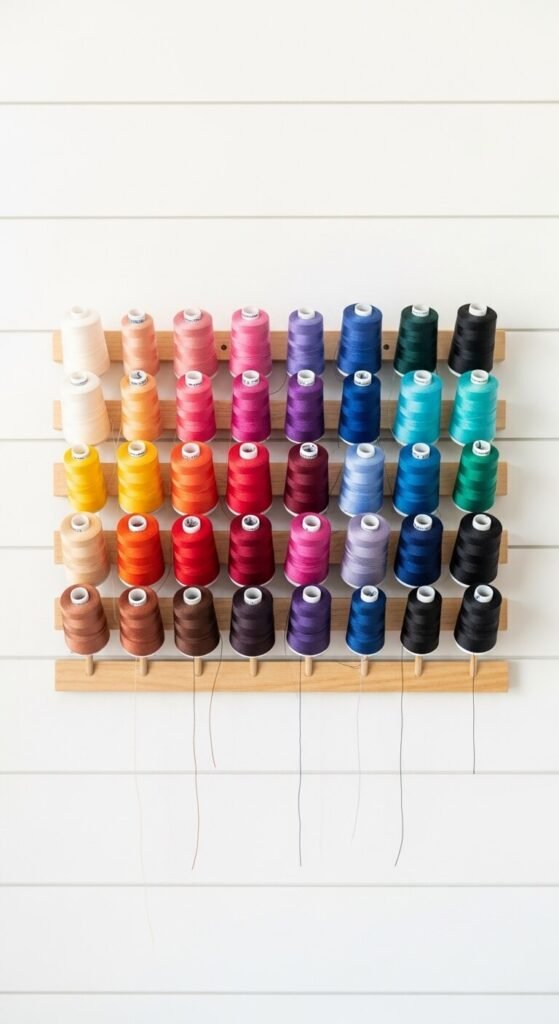Thread gets tangled fast when stored loose in a drawer. A wall-mounted thread rack solves this completely. Hang spools by color family so finding the right shade is instant. Racks come in wood or acrylic and mount directly to the wall. They range from $15 to $40 depending on spool capacity. This also keeps thread visible so you can see when you are running low on a color. It turns a messy drawer problem into functional, beautiful wall decor.