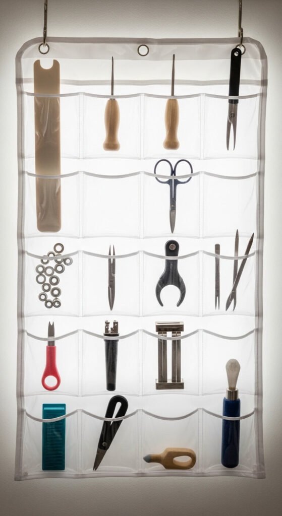 Clear hanging jewelry organizers have small, perfectly sized pockets that work beautifully for craft tools. Hang one on a wall or back of a door. Each pocket holds one type of tool. Bone folders, styluses, awls, heat guns attachments, and small stamps all fit well. Because the pockets are clear, finding what you need takes seconds. You can find these organizers for $10 to $15 at home goods stores. They fold flat for storage if you ever need to reclaim the wall space.