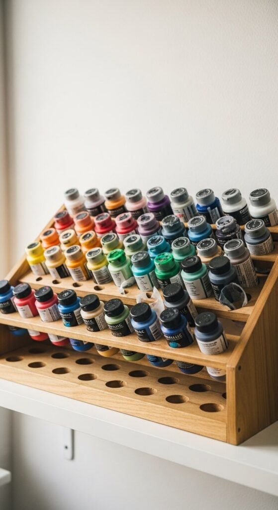 Acrylic paint bottles should be stored upside down so the paint stays at the nozzle and does not dry out near the cap. A tiered paint rack keeps bottles organized by color and makes grabbing the right shade quick. You can buy pre-made wooden racks or make a simple one with scrap wood and some drilling. Labels face outward so you can read them at a glance. This system works for any bottle-style paint including watercolor, fabric, and dimensional paint.