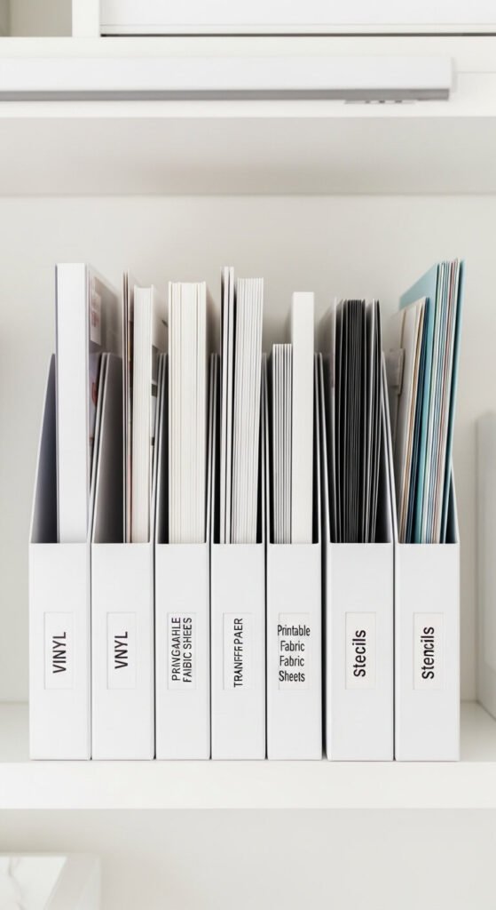 Flat sheets of vinyl, transfer paper, and stencils are notoriously difficult to organize. They slide around, get creased, and resist every bin you try to put them in. Magazine file holders are the answer. Stand sheets upright inside each file, sorted by type or color. Label the spine of each file so you can find what you need from across the room. A set of six white magazine files costs under $15. They sit neatly on a shelf and keep flat materials in perfect condition.