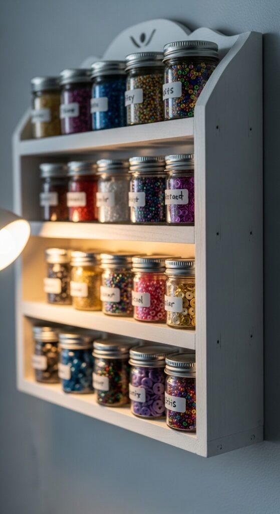 Spice racks are cheap, small, and perfect for tiny craft supplies. Pick one up at a thrift store or dollar store. Mount it on the wall and fill it with small jars of glitter, buttons, beads, or brads. Glass spice jars with lids keep contents fresh and visible. You can see exactly what you have at a glance. This hack works especially well for mixed media artists or scrapbookers who deal with lots of tiny embellishments daily.