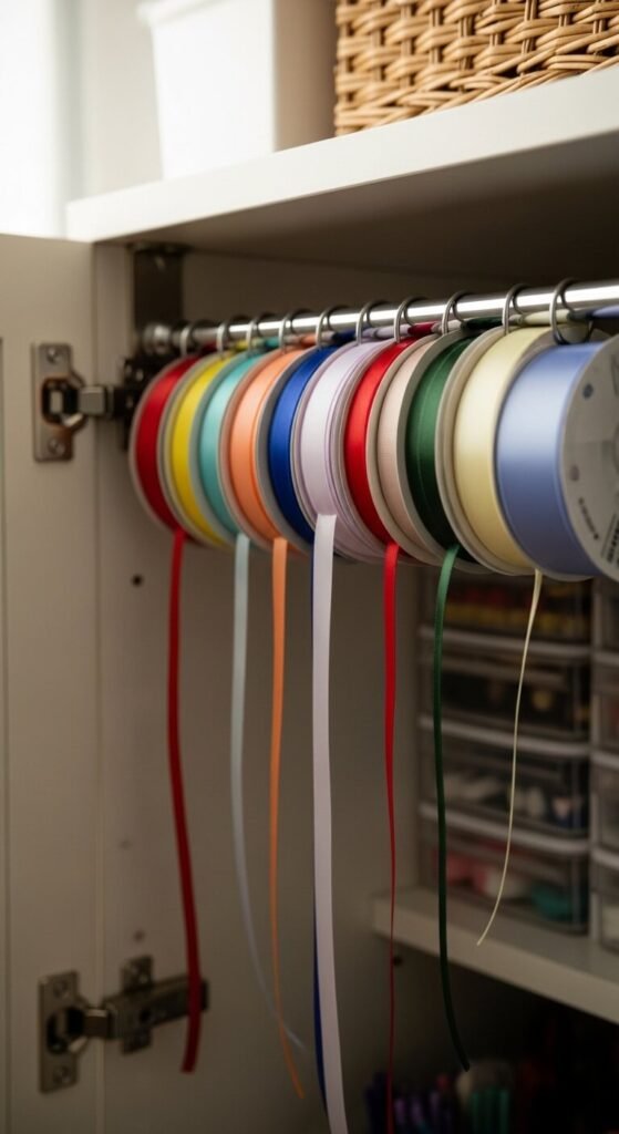 Ribbon storage is a common craft room nightmare. Spools unravel, tangle, and get lost in drawers. A simple towel rod fixes all of that. Mount one inside a cabinet door or on the wall. Thread your ribbon spools directly onto the rod. They spin freely, so you can pull ribbon without unspooling the whole thing. This solution costs almost nothing if you repurpose an old rod. It keeps ribbon tidy, visible, and easy to grab mid-project.