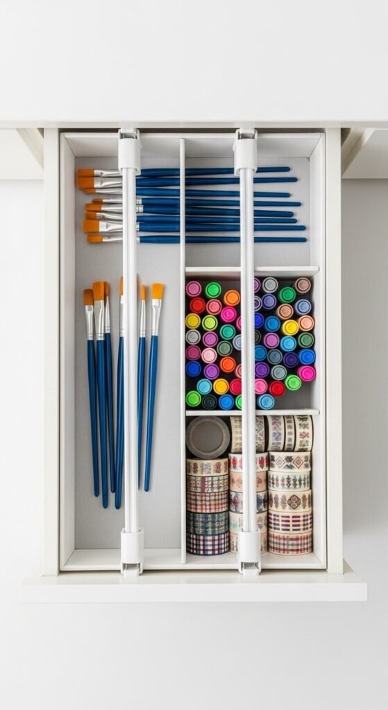 Deep drawers become black holes without dividers. Tension rods are a brilliant, no-drill fix. Drop a few into any drawer to create custom compartments. Adjust them to fit your exact supplies. Use one section for markers, another for brushes, another for rulers. No tools required and no permanent changes to your furniture. You can find tension rods for under $5 each. They work especially well in wide, shallow drawers where everything tends to slide around.