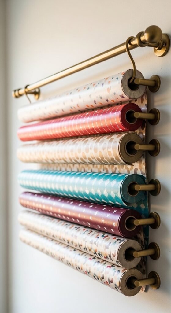 Wrapping paper rolls are awkward to store. They fall over, get crushed, and take up valuable floor space. Mount a curtain rod low on the wall and hang your rolls horizontally. Sort by pattern or color so you can find the right one quickly. This keeps rolls off the floor and out of the way. It costs almost nothing if you already have an extra curtain rod. You can add a second rod above it as your collection grows.