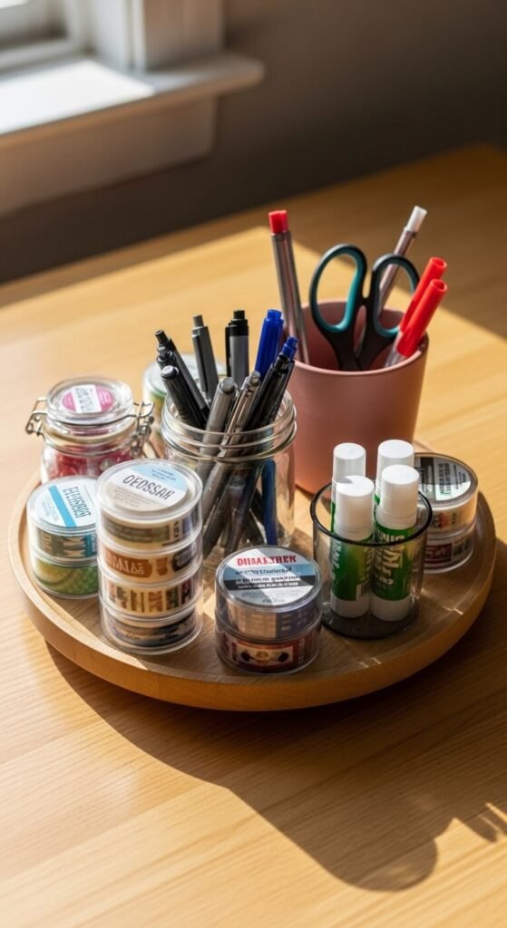 A lazy Susan on your desk means everything spins to you instead of you reaching across your workspace. Group similar supplies together in small cups or jars on the turntable. Scissors in one cup, pens in another, glue sticks in a third. Spin it to grab what you need without knocking other things over. Lazy Susans come in wood, acrylic, or plastic and cost between $8 and $20. They work just as well on shelves inside cabinets.