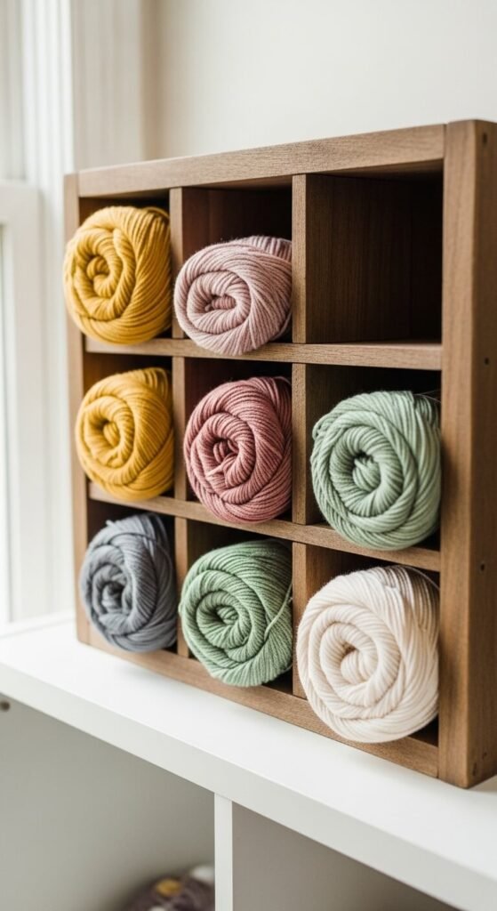 Yarn skeins fit perfectly into wine rack cubbies. If you knit, crochet, or weave, this hack is a must-try. A wooden wine rack from a thrift store costs almost nothing. Roll your yarn into neat balls and stack them by color. It looks beautiful and keeps skeins from tangling. It also doubles as decor. Place it on a shelf, on the floor, or on a countertop. You get storage and a colorful display that makes your space feel intentional.