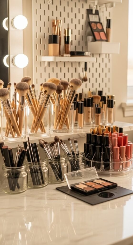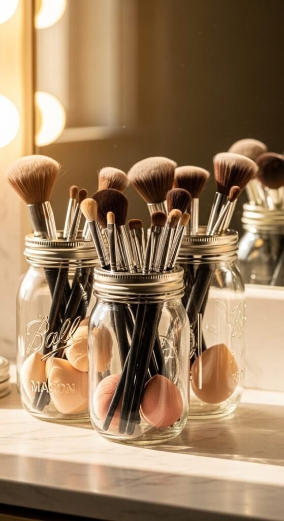 Mason jars or old candle jars make beautiful brush holders. Fill the bottom with decorative stones or dried beans to keep brushes upright. Group them by brush type — face brushes in one, eye brushes in another. This setup costs almost nothing if you reuse jars you already have. It looks polished on any vanity and keeps brushes clean and separated. You can paint the jars or tie ribbon around them to match your space.