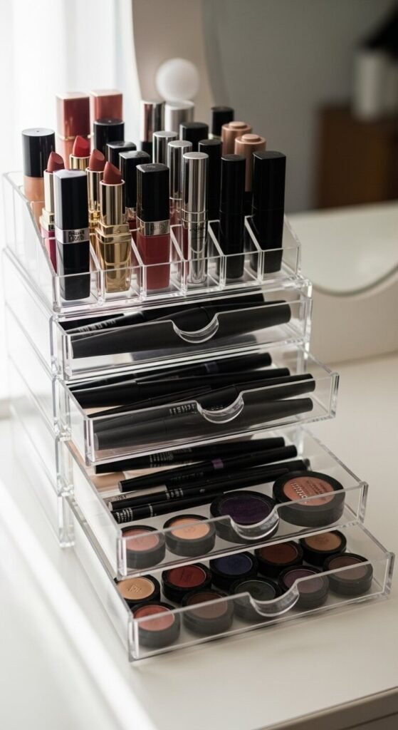 Clear acrylic towers let you see every product at a glance. Label each drawer by category — lips, eyes, base, tools. No more opening every drawer to find your liner. You can find these organizers at stores like IKEA or Amazon for $20–$40. If your collection grows, just stack another unit on top. The clear design keeps everything looking clean even on a busy counter.