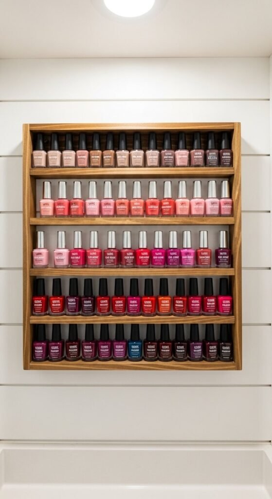 A tiered spice rack mounted on the wall makes a perfect nail polish display. Sort bottles by color family so picking a shade is fast and fun. You can grab these racks secondhand or at a dollar store for just a few dollars. Mount it at eye level near your vanity. It keeps bottles off the counter and turns your collection into decoration. Add a small label underneath each row if you want to stay extra organized.