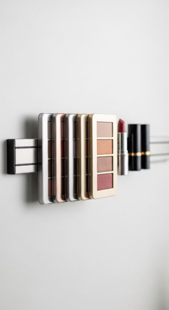 A magnetic knife strip — yes, the kitchen kind — holds metal makeup palettes perfectly. Mount it on a wall or inside a cabinet door to save counter space. Most metal palettes and compact cases stick right on. You can find magnetic strips at kitchen stores or online for $10–$20. This is especially great for small spaces. No shelf needed, no clutter, and your palettes are always in sight and easy to grab.