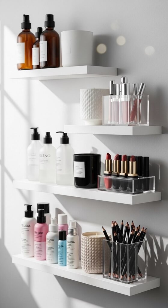 Floating shelves turn your products into a styled display. Use the top shelf for skincare, middle for palettes, and bottom for everyday products. You can find budget shelves at IKEA or Target for under $15 each. Keep items grouped and spaced out so it does not feel messy. Add a small plant or candle to make it feel like a real vanity moment. This works especially well if you do not have a dedicated vanity table.