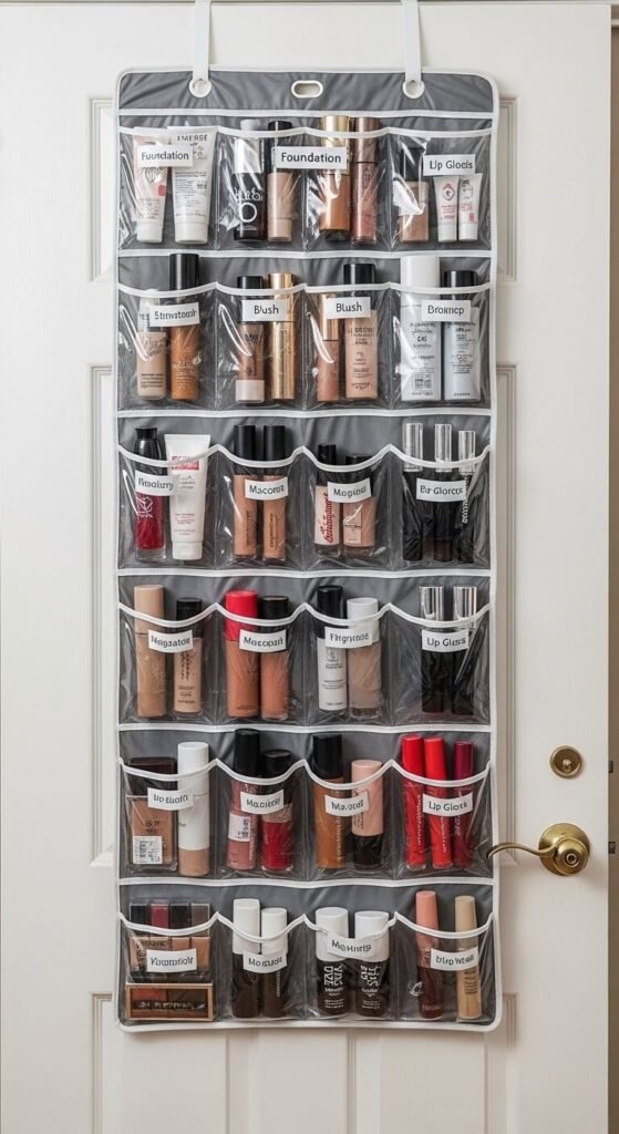 This is one of the most budget-friendly hacks. A clear pocket shoe organizer hangs over any door and holds dozens of products. Each pocket fits full-size bottles, palettes, and tools perfectly. You can get one for $5–$10. Label each row by category. It keeps products off your vanity entirely and frees up major counter space. Great for small bedrooms or bathrooms where storage is limited.