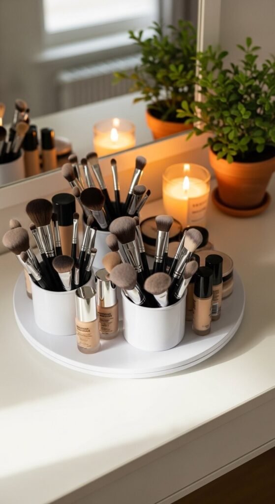 A lazy Susan spinner is a game-changer for vanity counters. Spin to reach products in the back without knocking everything over. Put your most-used items on the outside and extras toward the middle. You can find these at dollar stores or kitchen sections for $5–$15. Group them by category in small containers placed on top. This keeps your counter tidy without requiring any sorting every day.