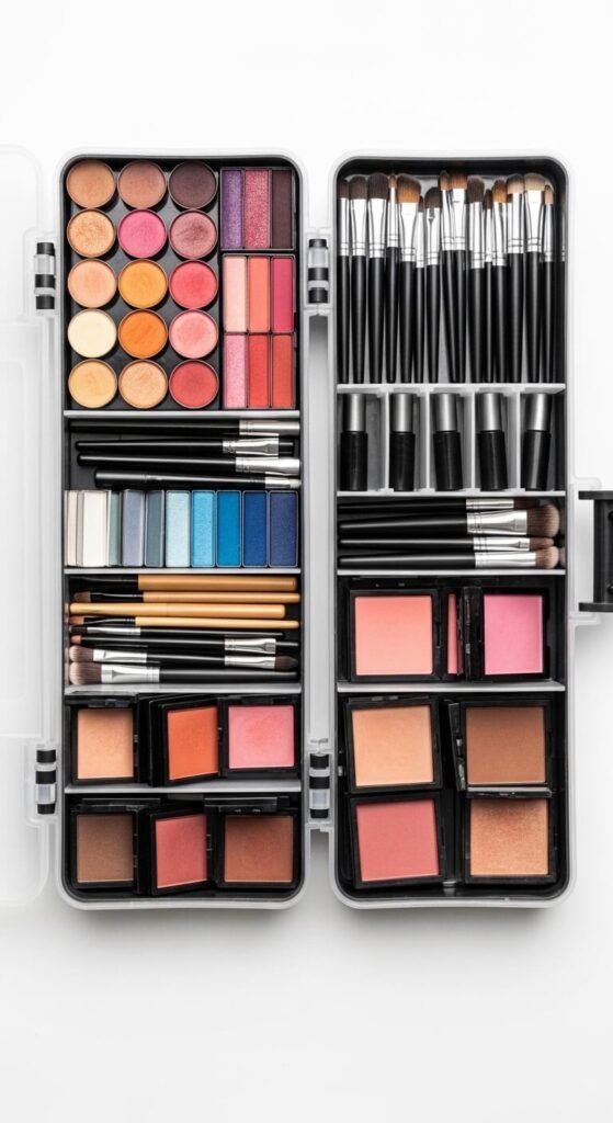 A fishing tackle box is secretly perfect for makeup storage. Each small compartment fits individual pans, liners, and tools. It snaps shut for easy travel and protects everything inside. You can find basic tackle boxes for $5–$12 at sporting goods or dollar stores. Customize the compartments by removing dividers to fit larger pieces. Great for travel kits or keeping a curated everyday kit separate from your main collection.