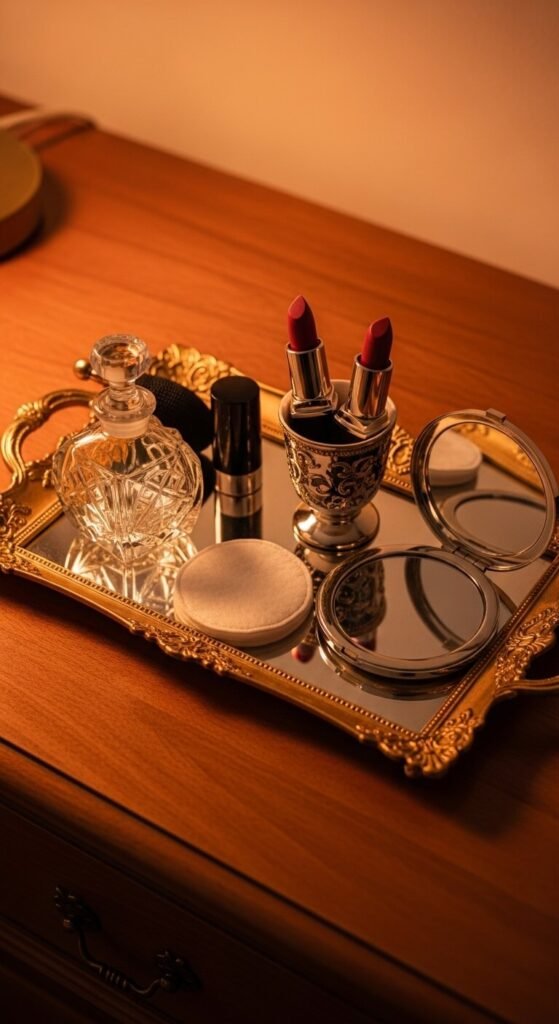 A pretty tray corrals your daily essentials without a big setup. Choose a tray with raised edges so nothing rolls off. Place only your daily-use products on it to keep things streamlined. Thrift stores often have beautiful trays for $2–$5. You can spray-paint one gold or white to match your space. It creates a visual boundary on your dresser and signals that everything inside belongs in your routine.