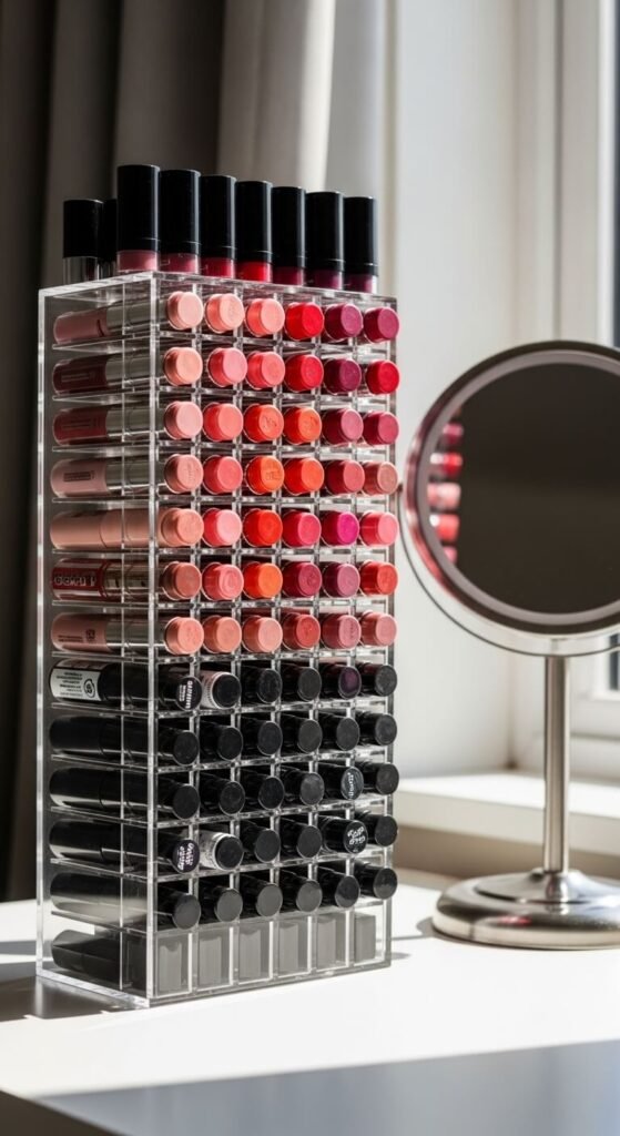 Lipstick towers are made for beauty lovers with large lip collections. Sort by color family or finish so finding the right shade is instant. Clear acrylic towers hold anywhere from 20 to 60 lipsticks depending on the size. They cost $10–$25 online or at beauty supply stores. You can also DIY a version using foam board and a box cutter — cut rows of holes sized for your tubes. Quick, easy, and completely customized.