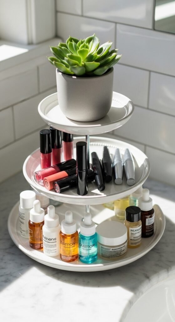 A tiered cake stand is an unexpected but brilliant organizer. Use the bottom for bulkier products, the middle for everyday picks, and the top for your favorite or most decorative items. Thrift stores often carry these for $3–$8. They add a chic, curated look to any vanity or bathroom shelf. Great for skincare routines too. The stacked levels mean you can store more in a small footprint without the clutter.