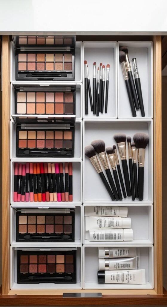 Drawer dividers turn a messy drawer into a sorted system. Lay palettes flat, line up lip pencils in rows, and separate brushes by type. Use adjustable bamboo or plastic dividers that fit your drawer size — they cost $5–$15. Measure before you buy. This method works best for vanities with deep drawers. Once you set it up, putting things back becomes automatic because every item has a spot.