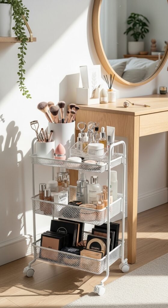 The IKEA RASKOG cart — or any small rolling cart — is a classic organizer hack. Roll it next to your vanity when you get ready, roll it away when you’re done. Each tier handles a different category. These carts cost $20–$40 and come in multiple colors. They are especially useful in shared spaces or bedrooms without a built-in vanity. Use small baskets or dividers inside each tier to keep products from shifting around.