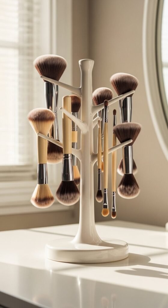 A mug tree works perfectly for hanging brushes bristle-side down. This keeps bristles in shape and lets air circulate after washing. You can find mug trees at kitchen stores or thrift shops for $5–$15. Choose one with at least 5–6 arms. Hang brushes by their handles. It keeps brushes separated and dries them faster after cleaning. A simple switch that makes a real difference in how long your brushes last.