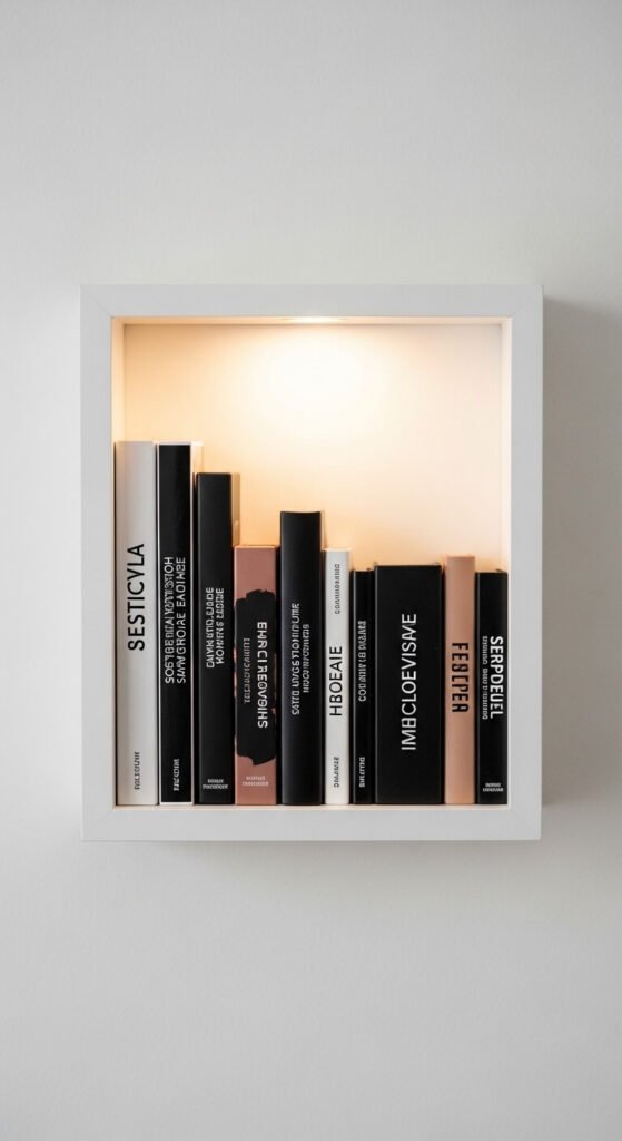 A deep shadow box frame displays your palettes like art. Stand palettes upright so the covers face out and you can see every one. This doubles as décor and a practical organizer. You can find shadow boxes at craft stores for $10–$20. Measure your palettes before buying the frame. Mount at eye level near your vanity mirror. It keeps your most-used palettes accessible and off your counter while showing off your collection.
