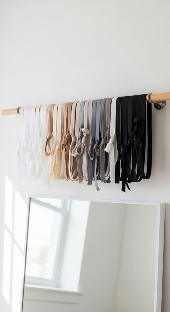 Headbands and hair accessories take up way more space than they should. Mount a wooden dowel or curtain rod on the wall and slide all your headbands over it. They stay organized, untangled, and easy to grab. A basic dowel and two small brackets cost under $10 at hardware stores. You can paint the dowel to match your room. This small setup makes a big difference in how tidy your beauty space feels.